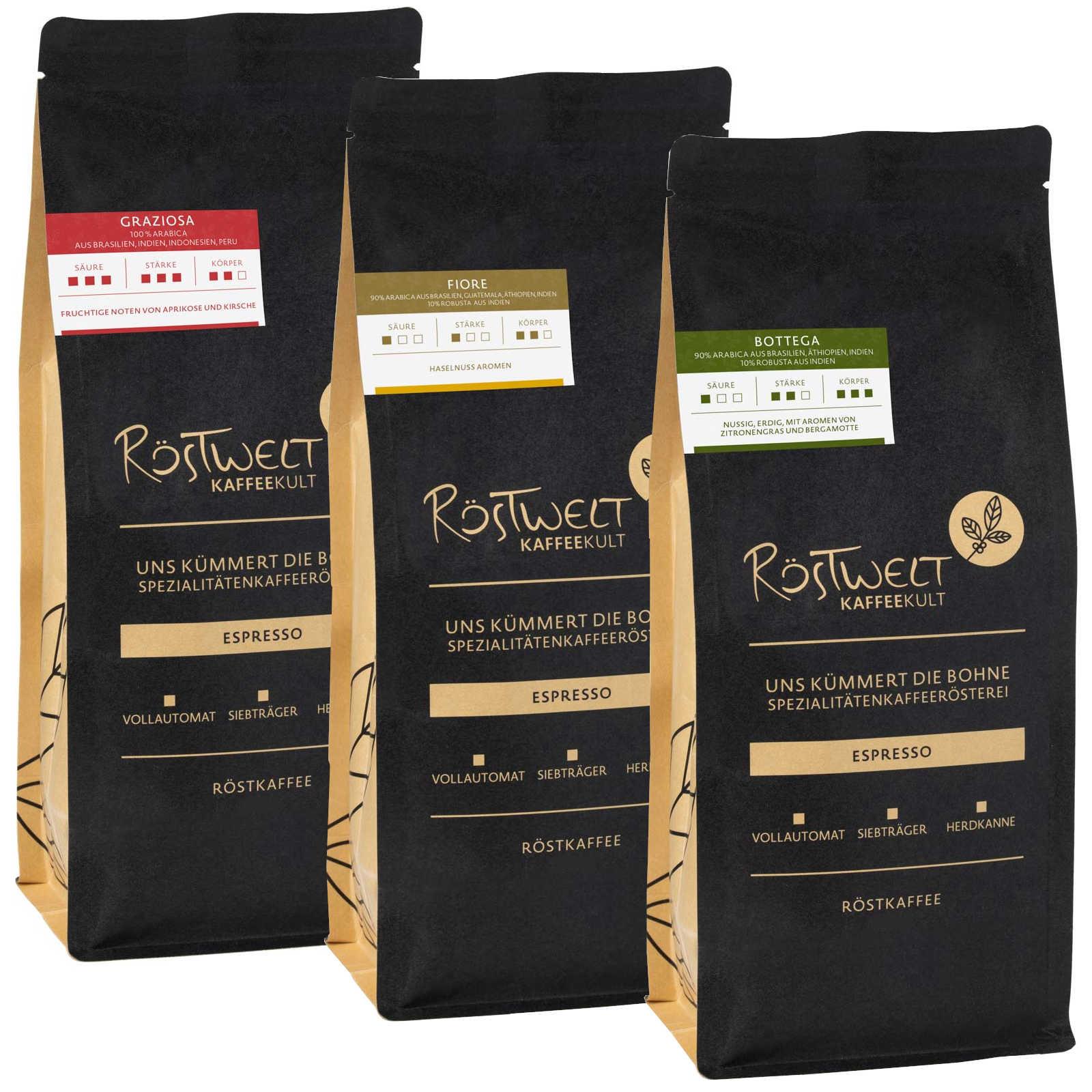 bestehend aus: Espresso Graziosa, Espresso Dolce, Espresso Bottega Drei verschiedene Sorten Espresso, a 250g, in dem von Ihnen gewünschten Mahlgrad